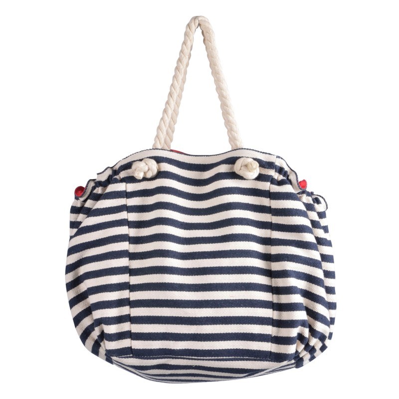 Borsa in canvas rigato. Manici in corda con nodo. Fodera e tasche interne a contrasto. 79 euro