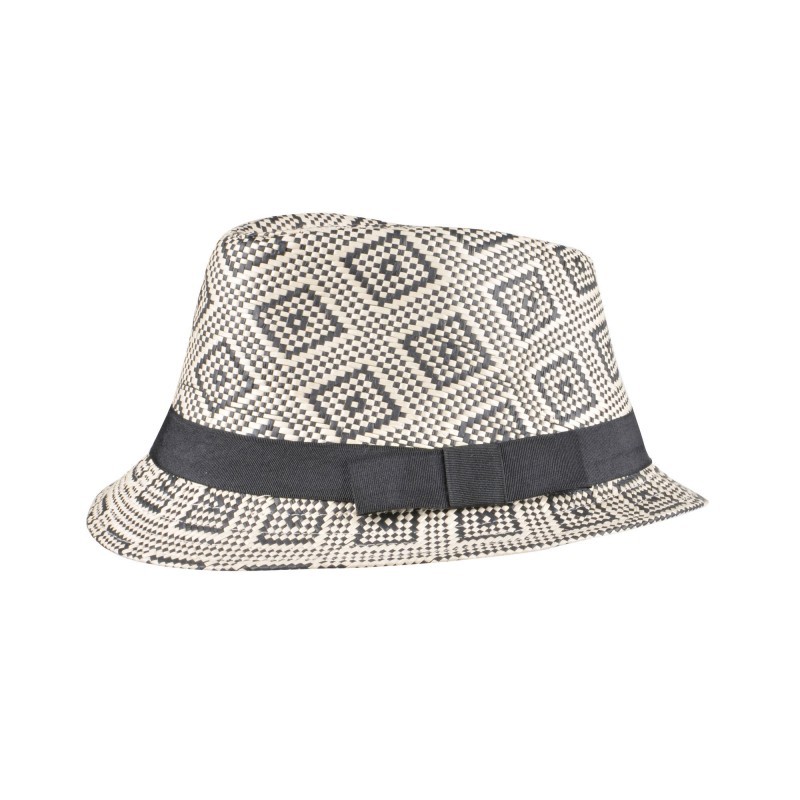 Cappello in fantasia geometrica jacquard bicolore. Fettuccia di gros grain che forma fiocco. 39 euro