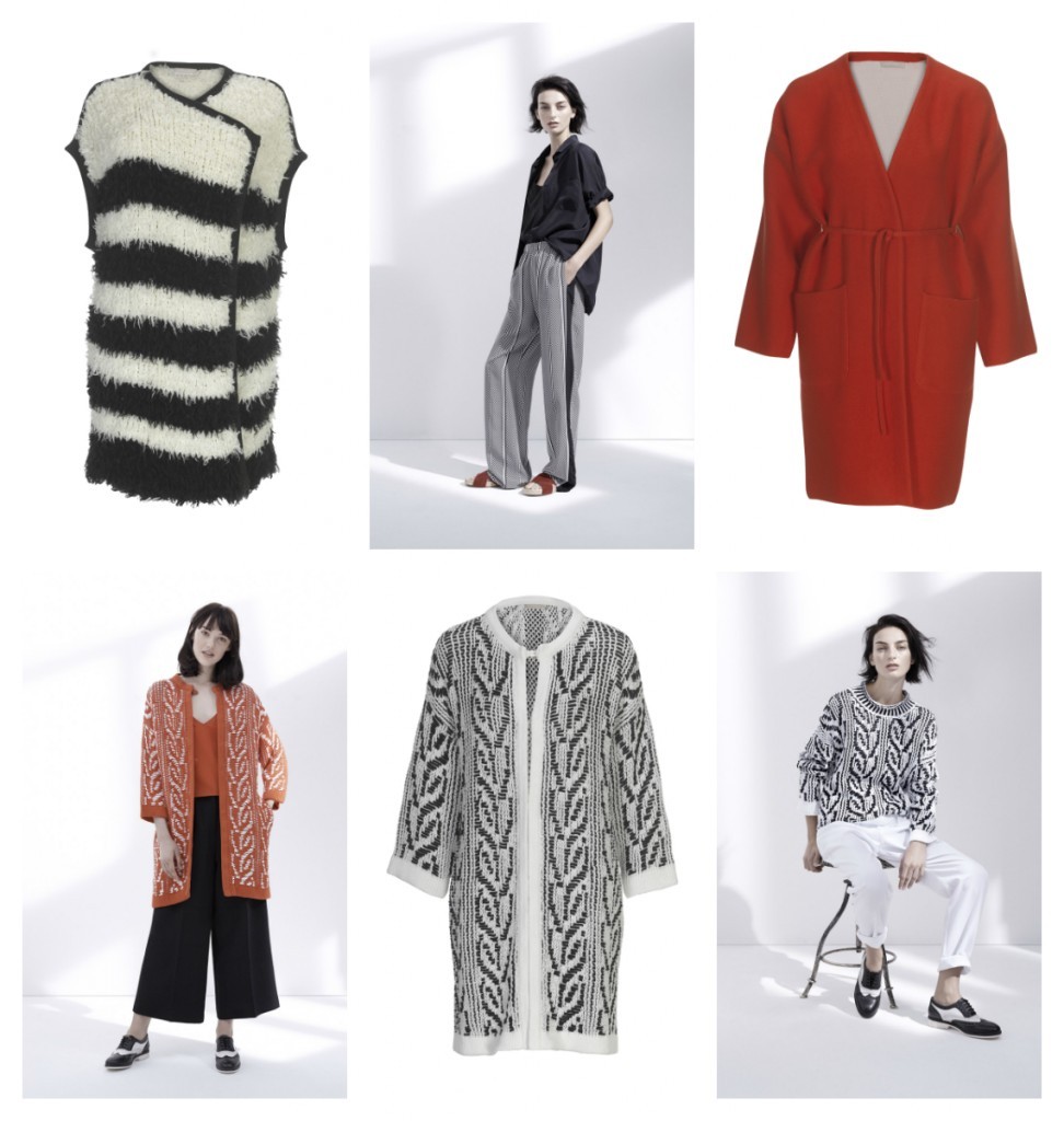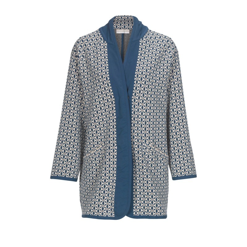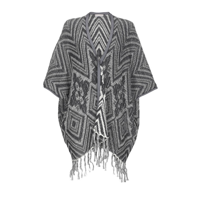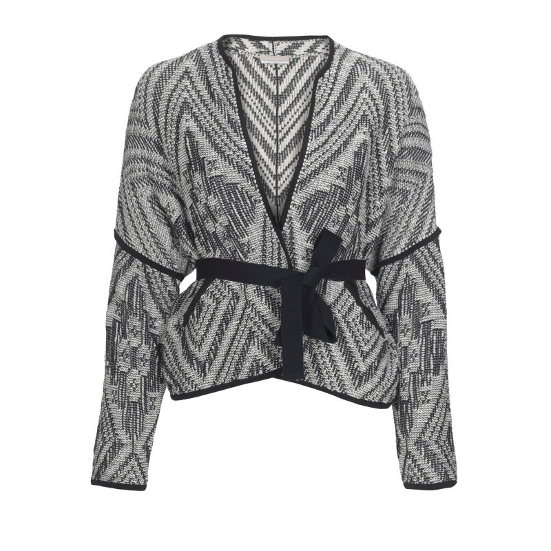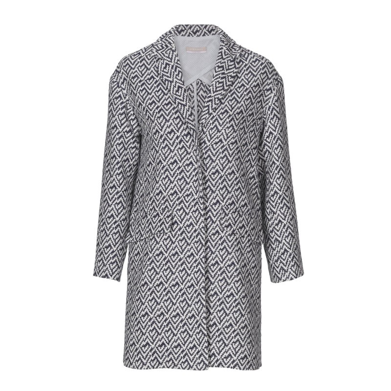 Cappotto in maglia di viscosa stretch. Fantasia geometrica jacquard. Tasche oblique. Chiusura con bottoni. Dettagli in tessuto di cotone in tono a contrasto 270 euro