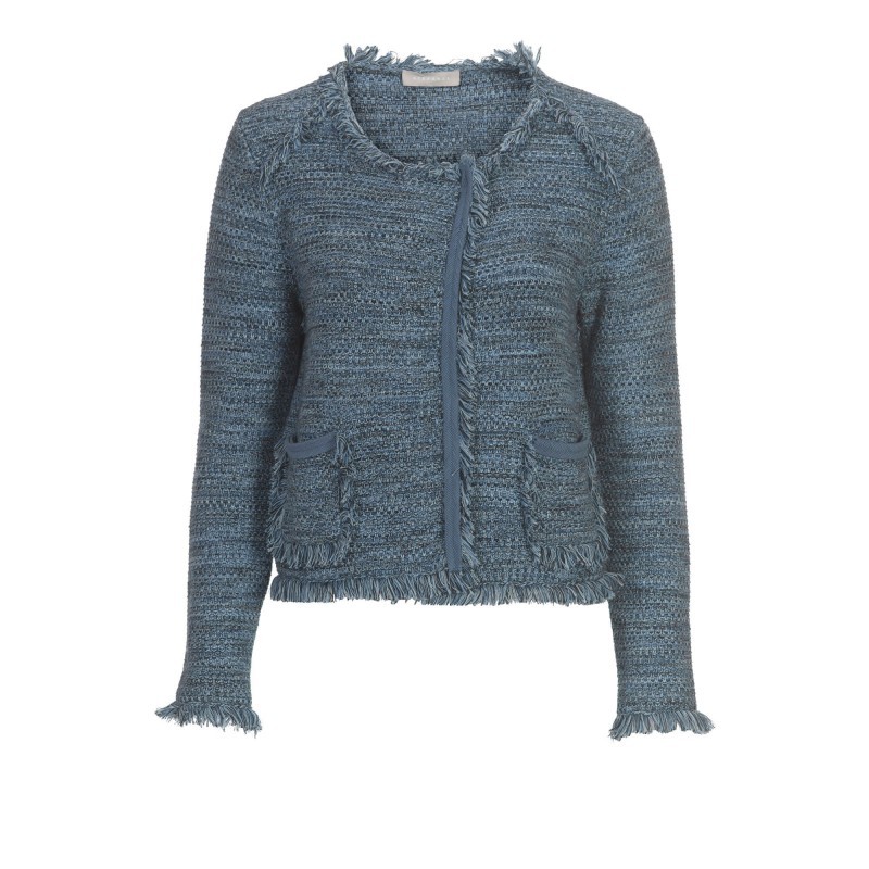 Giacchino in maglia di cotone con abbottonatura nascosta, tasche frontali e motivo di sfrangiatura 130 euro