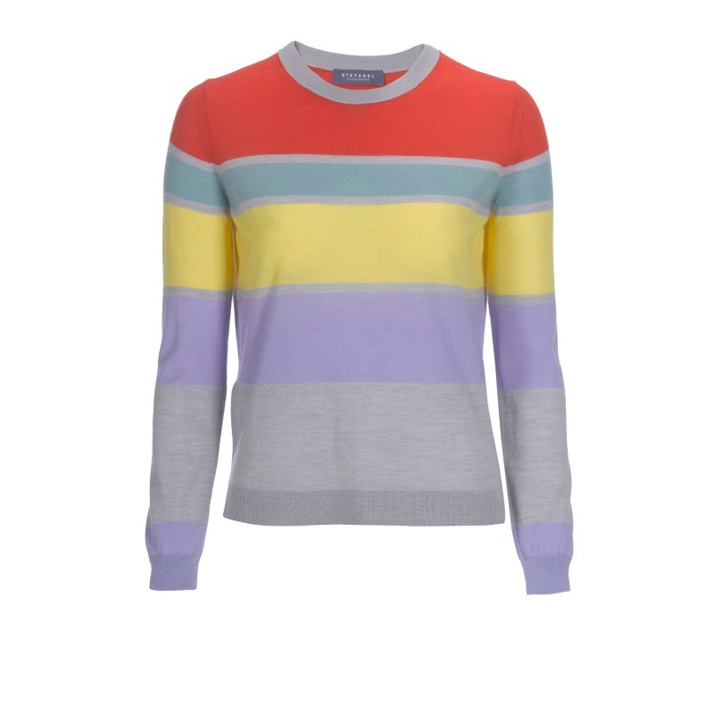 Maglia girocollo in cashmere-merinos. Motivo di righe multicolor. Spacchetti laterali. 180 euro