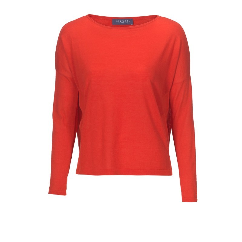 Maglia in cashmere-merinos. Scollo a barchetta. Inserti i seta su fianchi e maniche. 199 euro