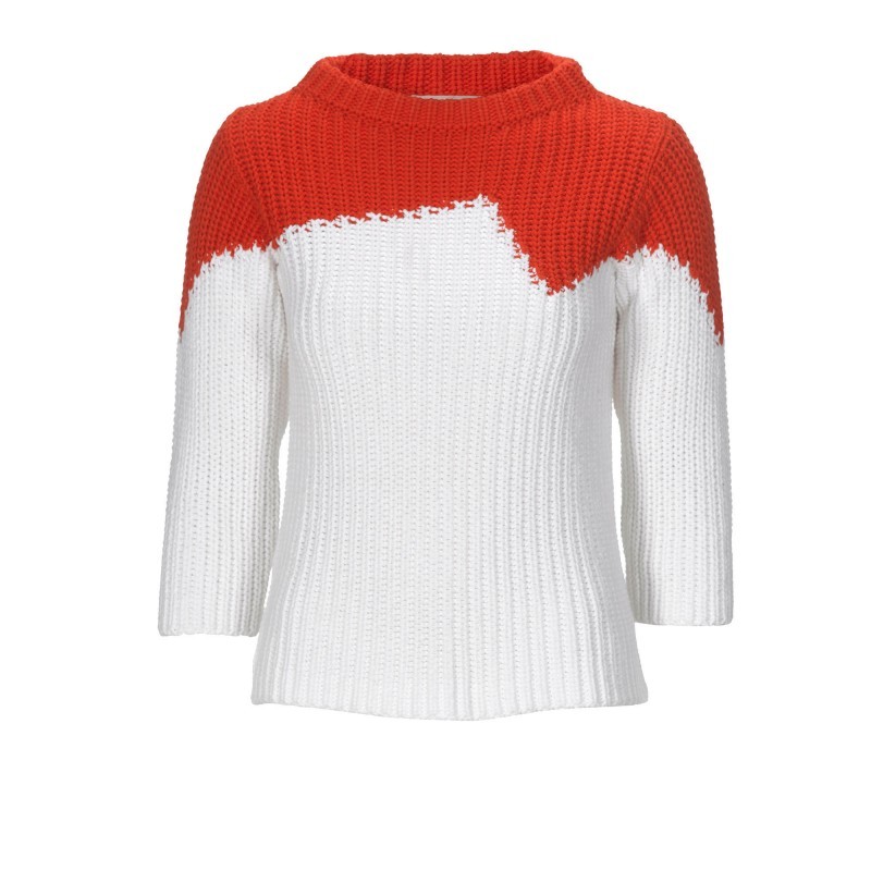 Maglia in cotone punto pannocchia. Collo montante. Fantasia geometrica a blocchi di colore. Manica a tre quarti 125 euro