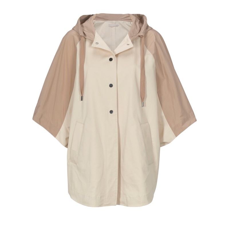 Mantella in gabardina e nylon, cappuccio e chiusura con bottoni a pressione 170 euro