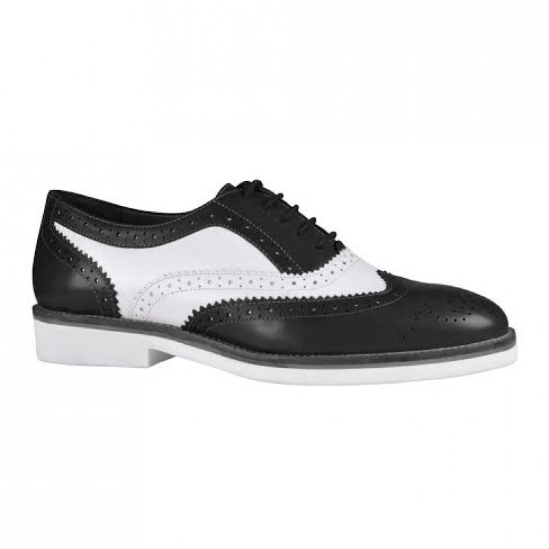 Oxford in pelle bicolore, di ispirazione maschile. Suola in gomma in tono a contrasto. 175 euro
