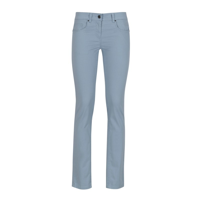Pantalone 5 tasche vestibilità regular in gabardina stretch. Bottoni, zip e rivetti metallici 79 euro