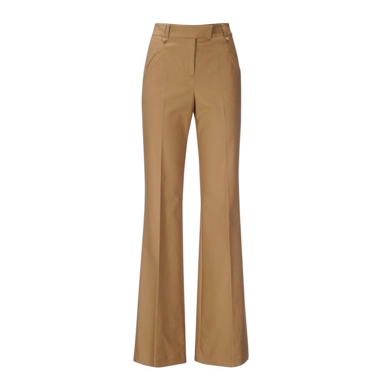 Pantalone in cotone doppio, vestibilità flare, abbottonatura nascosta, tasche a filetto e dettaglio passanti a punta 120 euro
