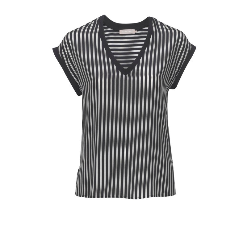 T-shirt manica corta in crepe de chine di seta rigato, profili collo e maniche in seta colore unito 99 euro