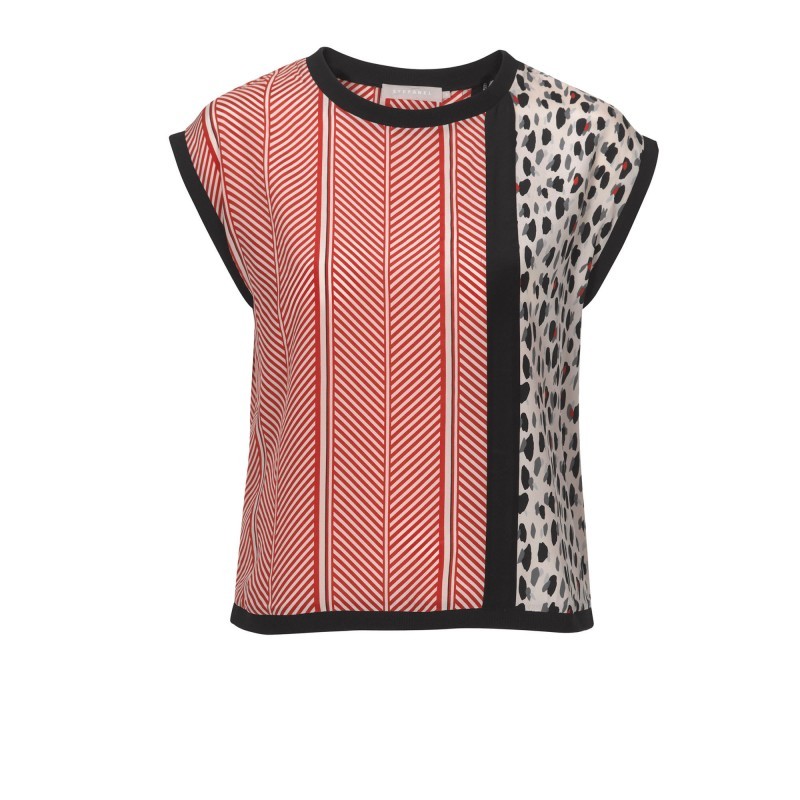 Top in crepe de chine di seta. Fantasia a blocchi asimmetrici con le stampe di collezione. Dettagli in unito a contrasto. 120 euro