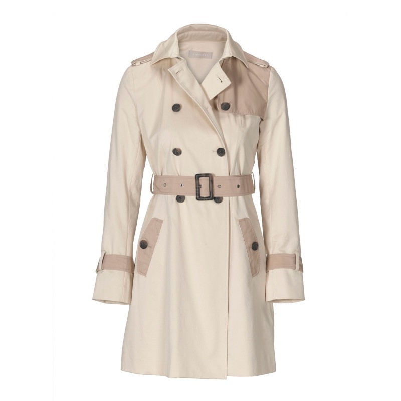 Trench in gabardina con dettagli in nylon, alamari su spalle e polsi, cintura con fibbia 199 euro