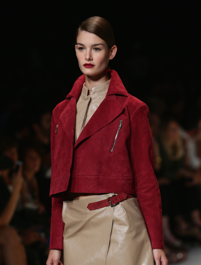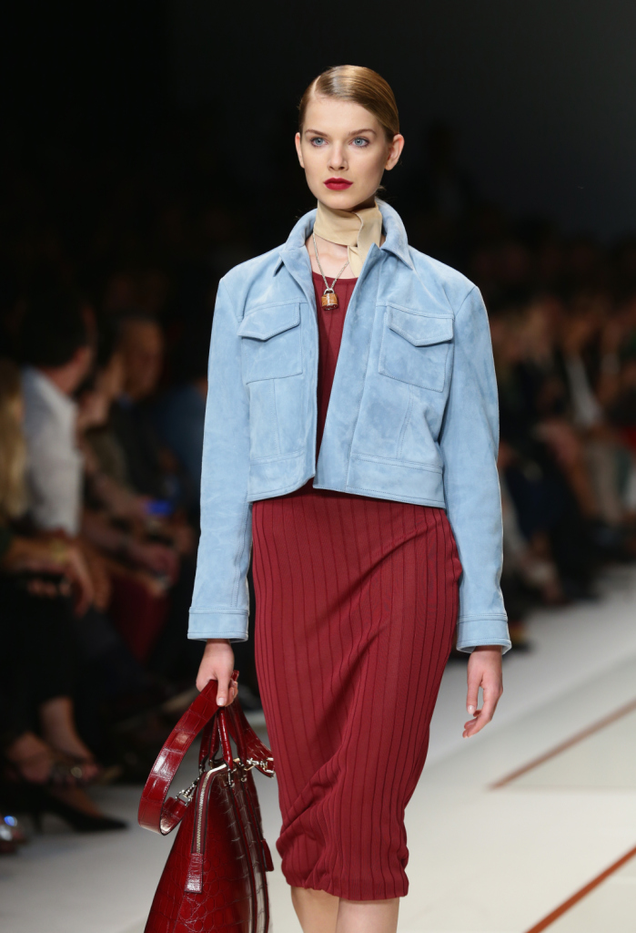 La pelle è il must have di Trussardi per la prossima stagione, proposta in diversi stili e colori. La troviamo sui pantaloni skinny, sulle gonne, gli shorts, i blazer e le giacche, impalpabile e leggera. Il taglio è grafico, pulito e netto con scolli a v che enfatizzano l’anatomia, tubini dritti, gonne a portafoglio e trench a doppiopetto. Gaia Trussardi gioca soprattutto con il colore proponendo giubotti corti in pelle azzurra o il chiodo in versione scamosciata.