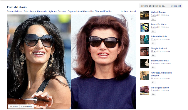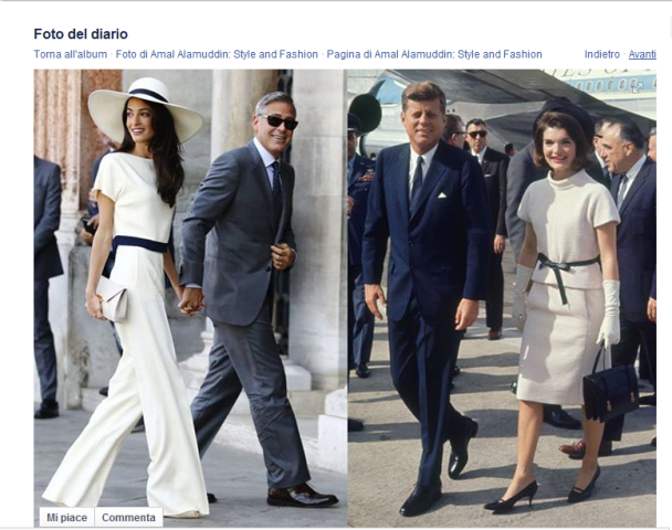 Il soprabito è un elemento cult nei look di Amal un po’ come gli occhiali da sole che, maxi, le danno l’aspetto da vera diva. In moltissimi suoi look, infatti, le similitudini con Jackie O lasciano esterefatti, nel gioco “trova le differenze” due foto a confronto: entrambe, Amal e Jackie, indossano un abito color rosa confetto.