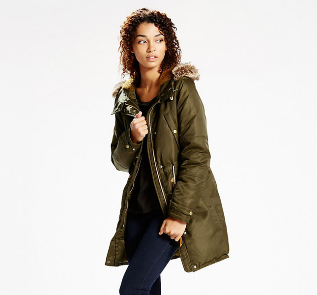 Ideale per il giorno è il modello proposto da Levi’s con cappuccio e pelliccia, verde militare e imbottito, da abbinare a un jeans stretch e un paio di biker boots neri.
