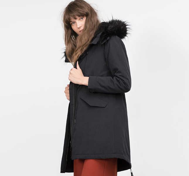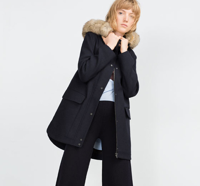Sempre per la versione night, magnifico ed elegante è il parka lungo in panno blu notte e con cappuccio firmato Zara.