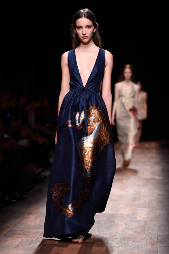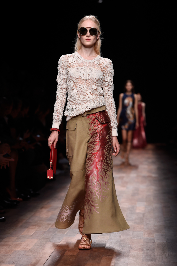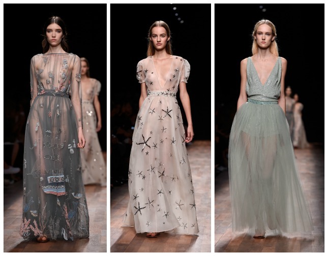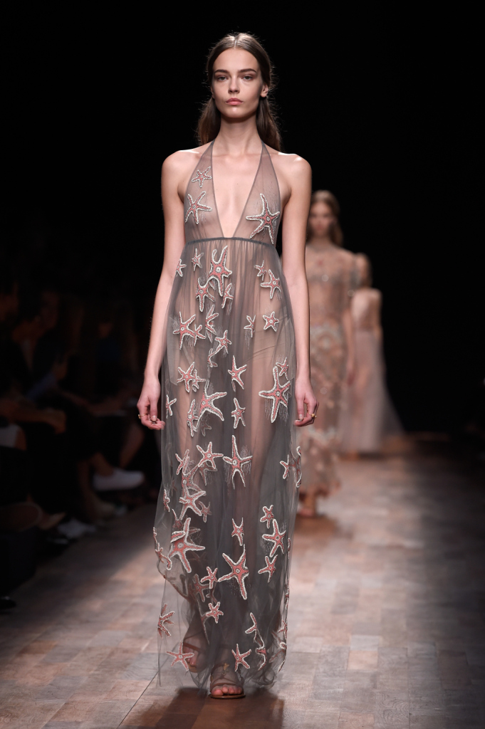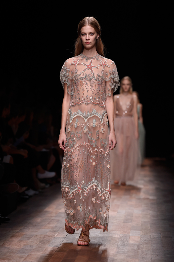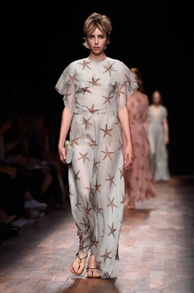 Le divinità greco-romane della prima parte della sfilata subiscono a poco a poco una metamorfosi, i loro abiti si fanno sempre più eterei e leggeri, le trasparenze sempre più visibili e dalla spuma del mare italico sembra fare la sua comparsa un essere quasi fiabesco, una sirena sulle cui vesti si posano argentee stelle marine, conchiglie e ricci di mare, meduse, coralli e cavallucci marini. L’artigianalità sartoriale della grande maison è visibile su alcuni abiti velati in cui piccoli frammenti di pietruzze colorate sono cuciti ad hoc assieme a piccoli volant e fili argentei che sembrano ricreare i fondali marini. Lembi di stoffa semicircolari sono applicati sulla gonna e sulle maniche di un abito in modo tale da ricordare squame di pesce e pinne, mentre particolarissimo è l’abito con stampa di stelle marine e top con bordi smerlati indossato dalla celebre modella Edie Campbell. Anche i sandali alla schiava e i fermagli sui capelli sciolti della sirena Valentino sono costellati qui e là da elementi naturali marini. Per quanto riguarda le borse, tra maxi doctor bag floreali e le bustine piatte con cinghia da polso e originale cinghia per inserimento mano, non poteva mancare la preziosissima mini-clutch con apertura fatta a corallo.