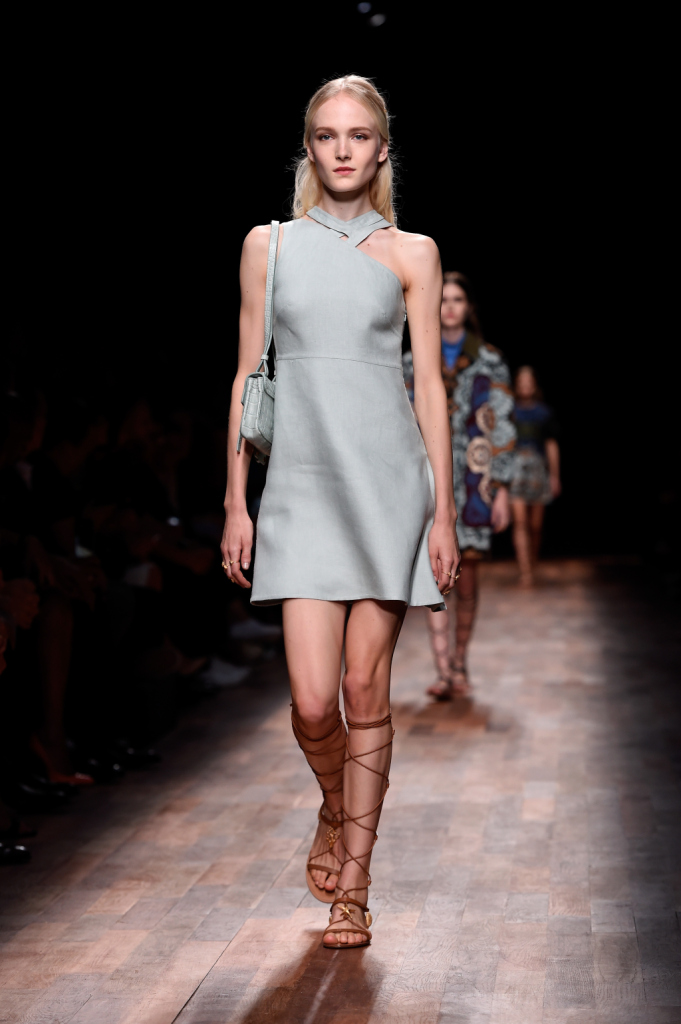 Valentino, PFW, collezione Primavera-Estate 2015: miniabito svasato tinta ghiaccio, monospalla con gioco ad intreccio