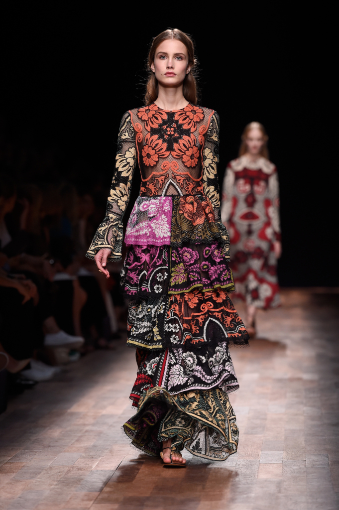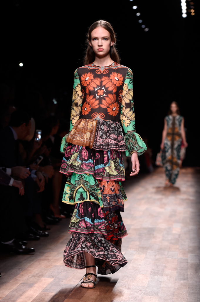 Valentino, PFW, collezione Primavera-Estate 2015: abito lungo con stampa floreale barocca, maniche lunghe a corolla e volant su tutta la lunghezza