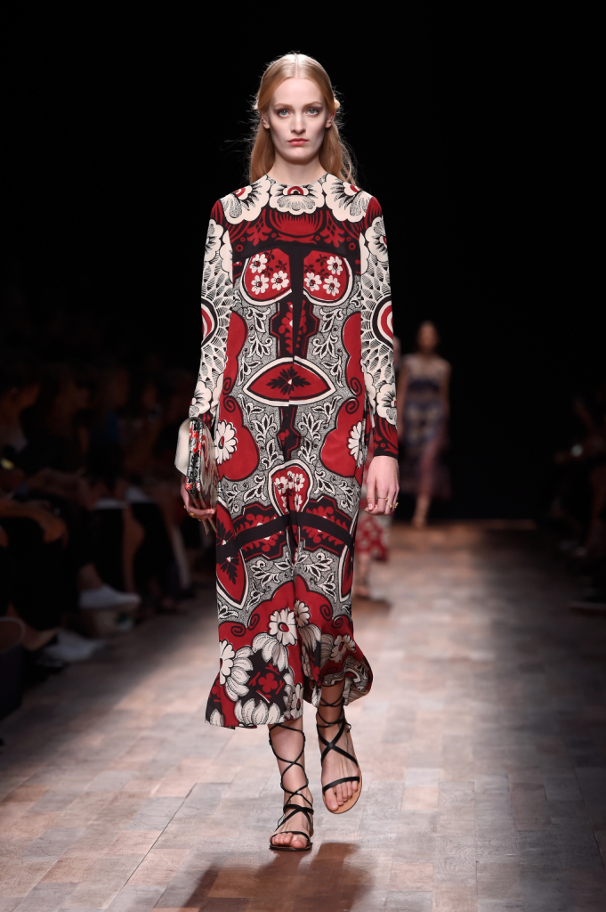 Valentino, PFW, collezione Primavera-Estate 2015: tunica lunga a “sacco” con stampa floreale barocca caleidoscopica