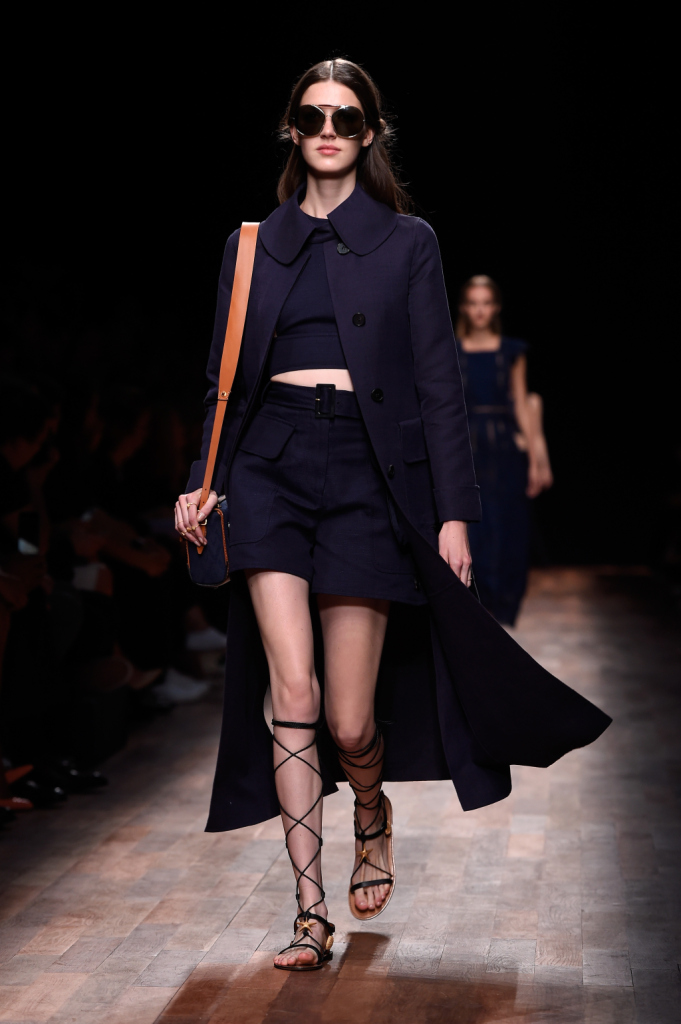 Valentino, PFW, collezione Primavera-Estate 2015: shorts a vita alta e top tagliato, maxi cappotto lungo in blu navy