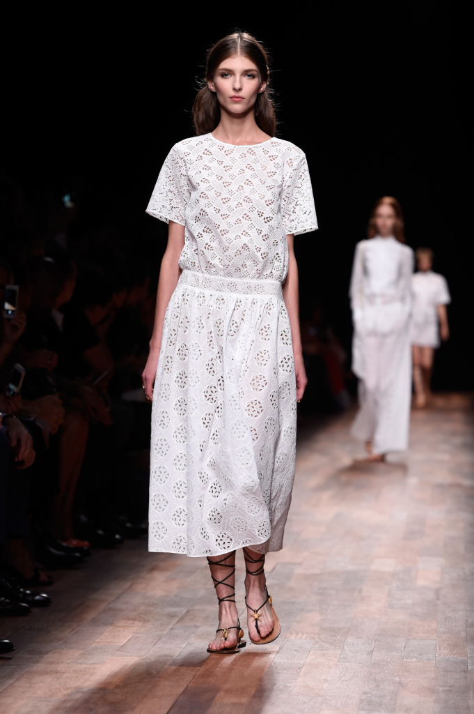 Valentino, PFW, collezione Primavera-Estate 2015: abito lungo in sangallo bianco, cintura appena pronunciata
