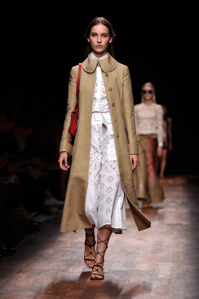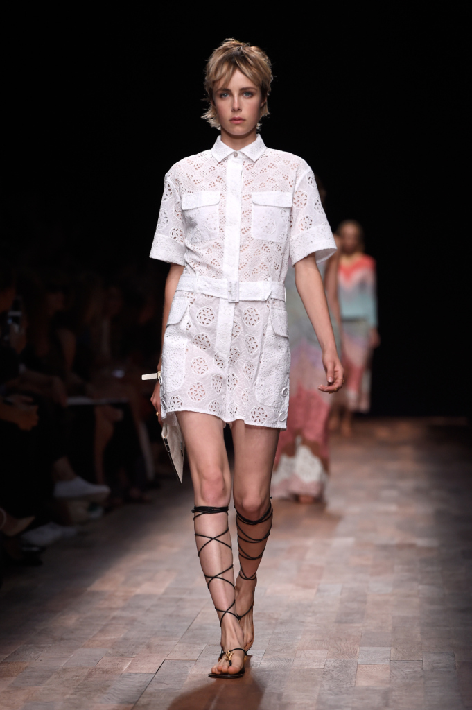 I primi fiori che sbocciano sulle stampe di abiti corti o cappotti dalle linee asciutte sono probabilmente ancora di derivazione barocca, con i loro giochi caleidoscopici e i colori accesi e vivacissimi. Ma il gusto neoclassico riaffiora subito alla superficie, in un abito lungo dalla linea semplice, con stampa fiorita, lunghe maniche con bordo a corolla e una serie di volant che cingono la gonna per tutta la sua lunghezza. Uno spruzzo di colore blu acceso per un completo con gonna e blusa dalla silhouette appena accennata e poi ecco comparire i primi abiti total white con ricchi adorni in sangallo: la vita è portata appena sotto il seno, in perfetto stile Impero, la scollatura si abbassa vertiginosamente fino alla cintura, in perfetto stile neoclassico, un periodo in cui l’eleganza di una donna si vedeva da come era ben “svestita” e non “ben vestita”. Una tuta in sangallo con coulisse in vita riporta la scena alla modernità, con cappotti e trench in lino beige su ampi pantaloni a palazzo o completi, ma poi l’atmosfera si fa subito più romantica con sottovesti e abiti perforati che si accendono in un arcobaleno dalle tinte pastello: azzurro, rosa cipria, giallo paglierino, terracotta, indaco e verde-acqua. Alcuni abiti in seta in blu scuro e rosso rubino distolgono per un attimo l’attenzione con le loro stampe argentee a tematica marina, ma poi le vesti trasparenti, tipiche del periodo greco-romano, la moda del “nudo” come veniva chiamata nel Settecento, ritornano alla ribalta, con ricchi drappeggi, gonne voluttuose e le tipiche spalline “a palloncino”, che un tempo erano sinonimo di lascivia perché mostravano il braccio nudo.