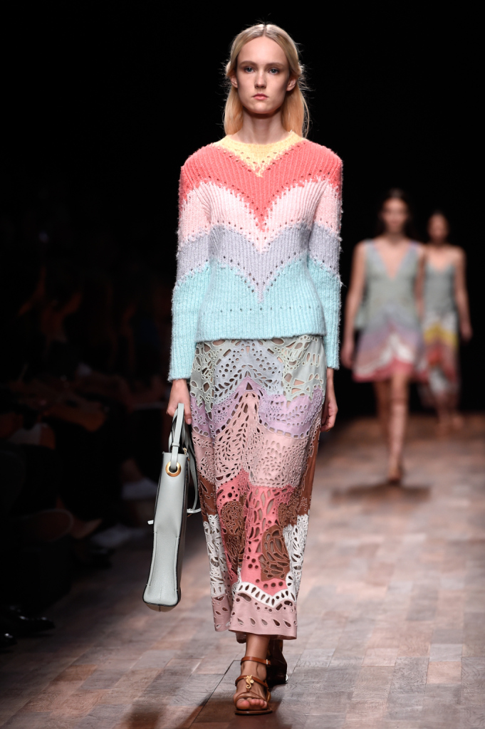 Valentino, PFW, collezione Primavera-Estate 2015: gonna lunga traforata nei colori pastello e maglioncino multicolor abbinato