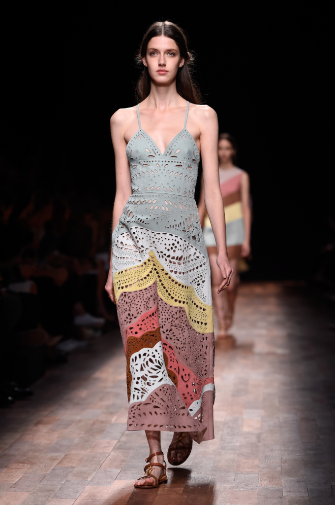 Valentino, PFW, collezione Primavera-Estate 2015: abito-sottoveste in tessuto traforato, gonna nei toni arcobaleno pastello