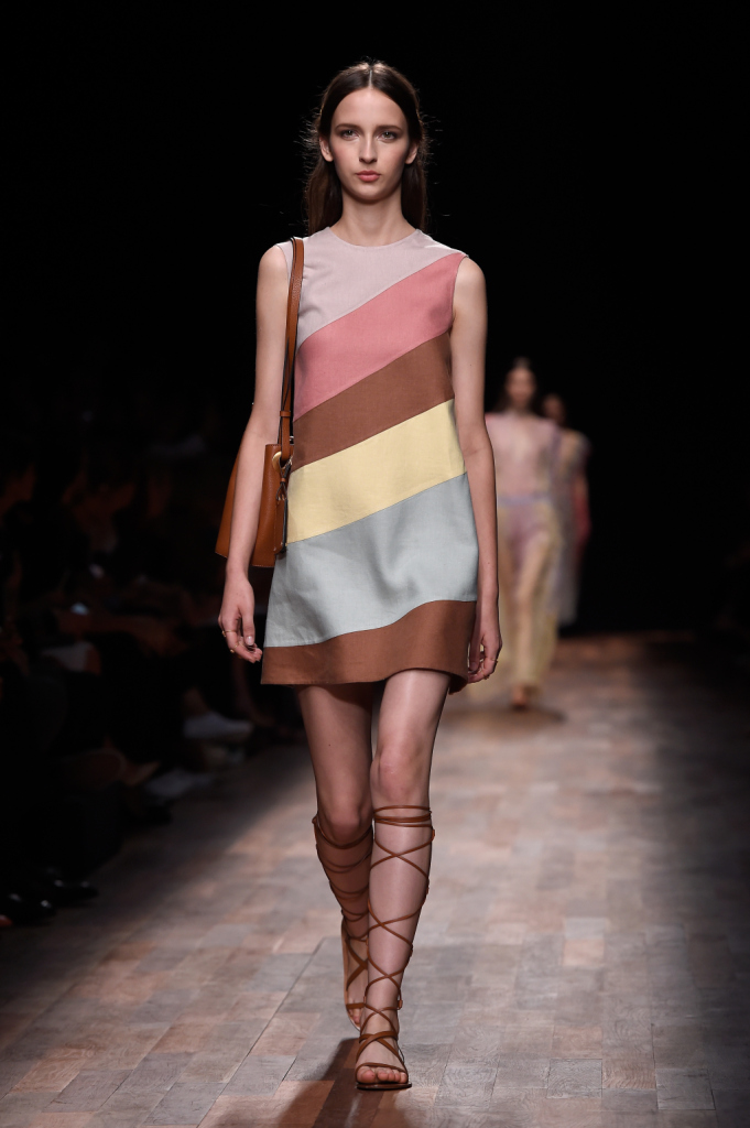 Valentino, PFW, collezione Primavera-Estate 2015: scamiciato con righe multicolor oblique e taglio leggermente svasato