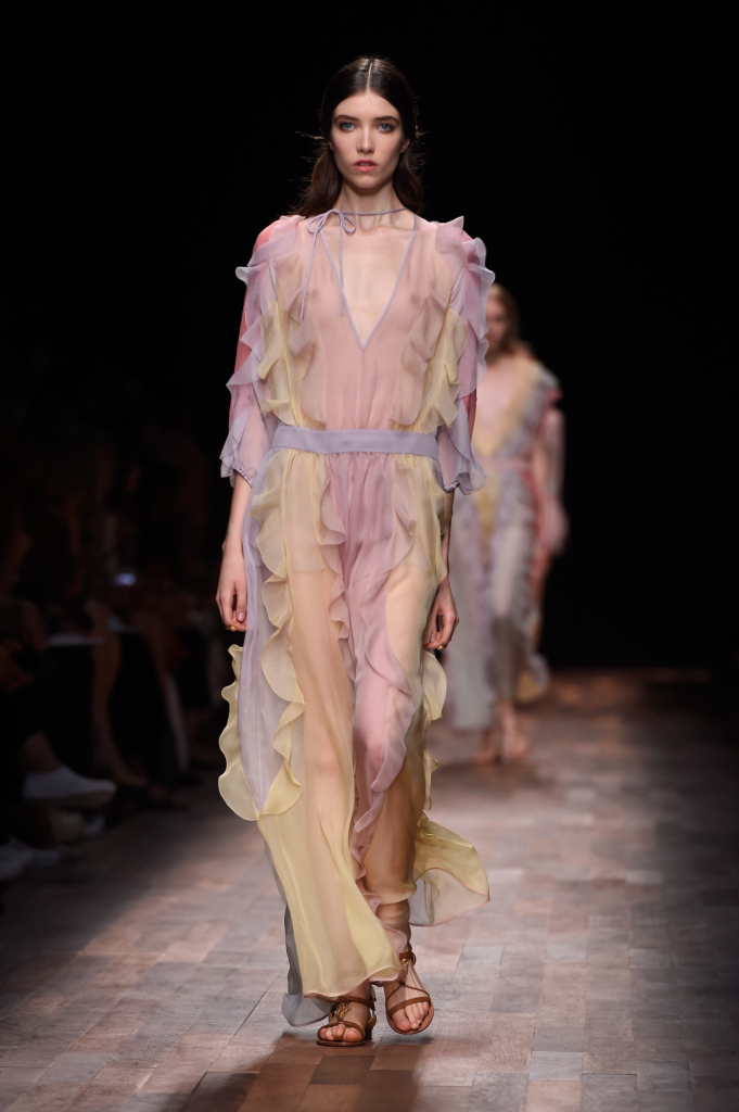 Valentino, PFW, collezione Primavera-Estate 2015: abito lungo con profondo scollo a V e laccetto, gioco di trasparenze con volant nei toni pastello