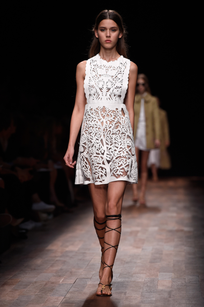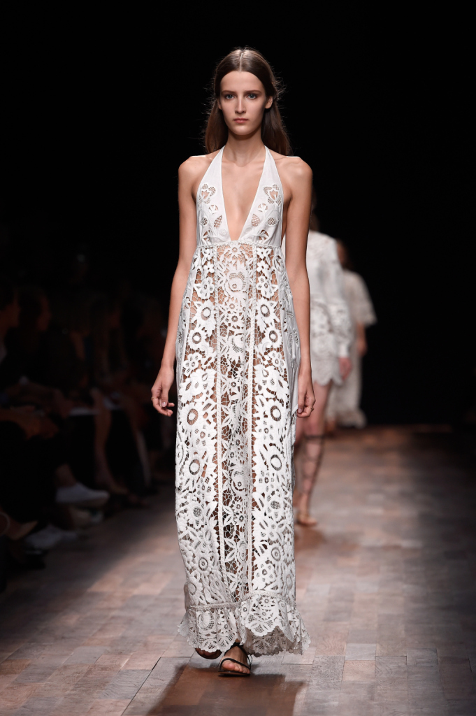 Valentino, PFW, collezione Primavera-Estate 2015: abito-sottoveste lungo in sangallo, bordo smerlato e profondo scollo a V