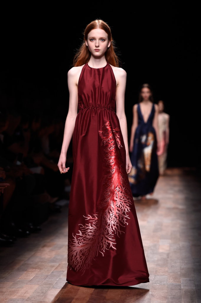 Valentino, PFW, collezione Primavera-Estate 2015: vestito lungo in seta con gonna appena svasata, disegno corallo sulla parte laterale