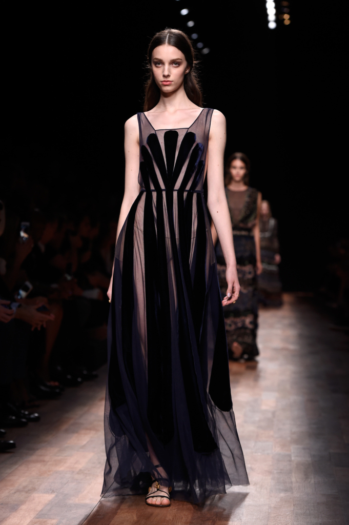 Valentino, PFW, collezione Primavera-Estate 2015: abito lungo nero semi-trasparente con pannelli neri