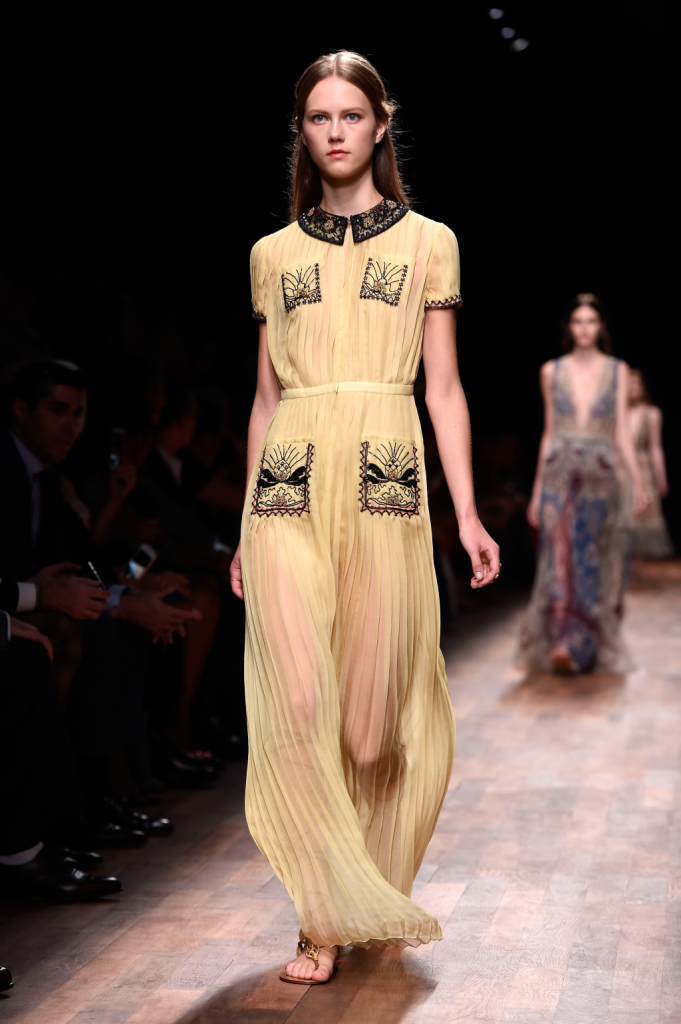 Valentino, PFW, collezione Primavera-Estate 2015: abito lungo giallo plissettato con ricami su colletto, bordi e tasche