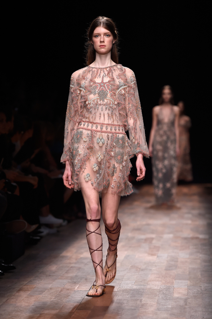 Valentino, PFW, collezione Primavera-Estate 2015: vestito anni Venti, con cintura morbida, tessuto trasparente con motivi marini ricamati di rosa e fili argentei