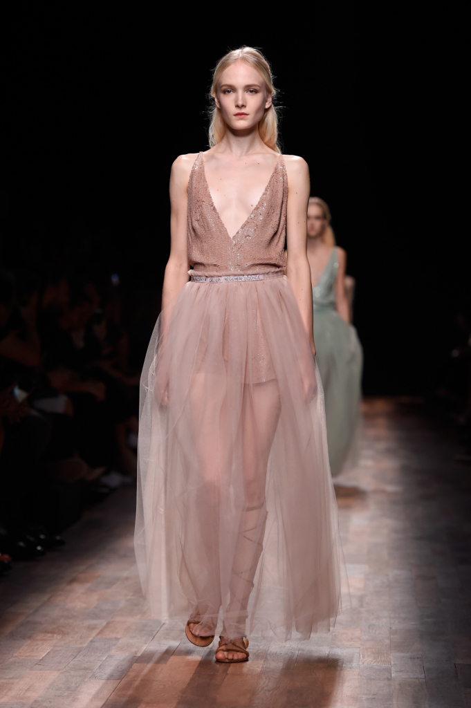 Valentino, PFW, collezione Primavera-Estate 2015: sottoveste glitterata nei toni del rosa con ampia gonna in tulle sopra