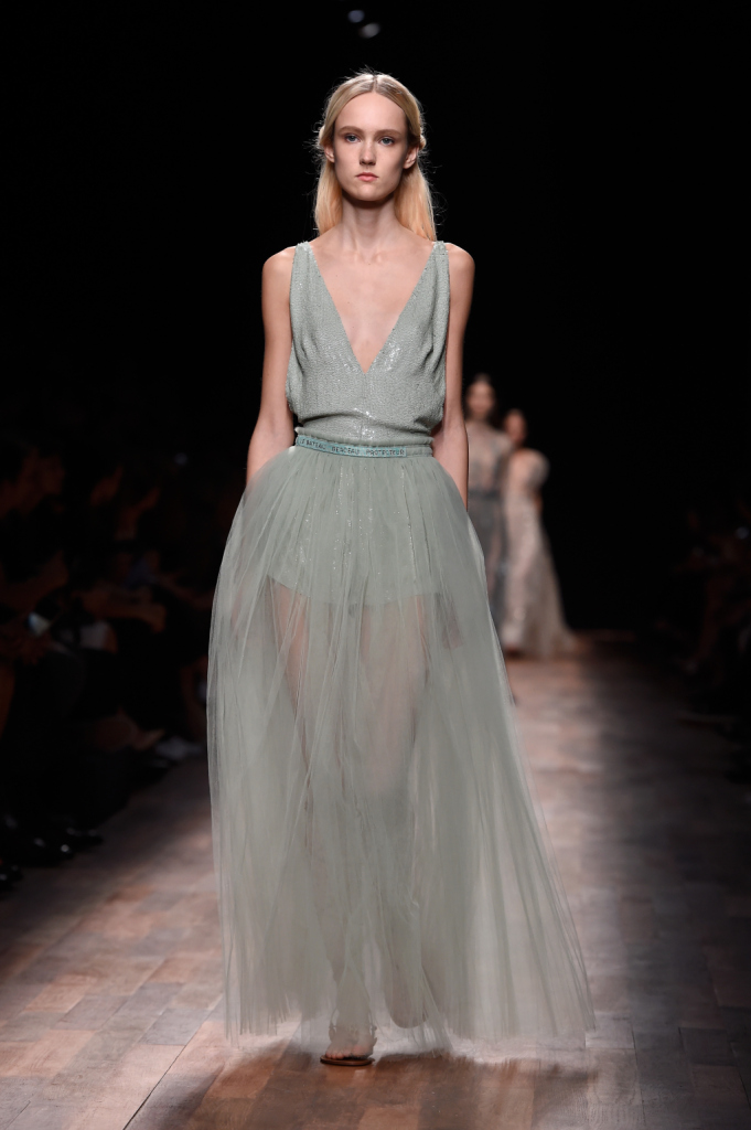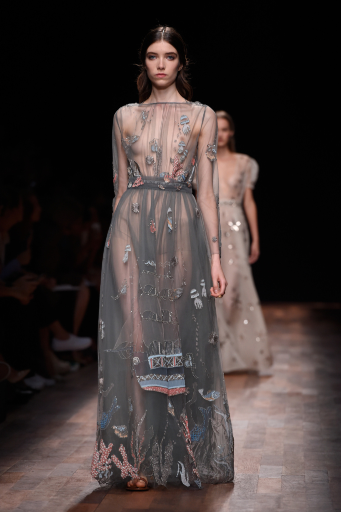 Valentino, PFW, collezione Primavera-Estate 2015: vestito lungo grigio con gioco trasparenze, drappeggi e motivi marini ricamati in azzurro e rosa