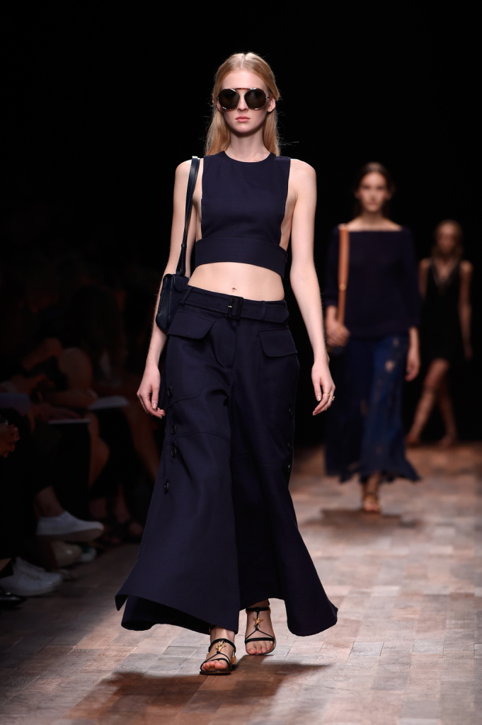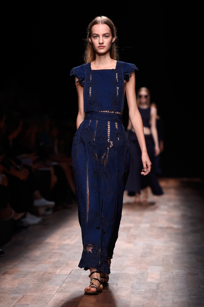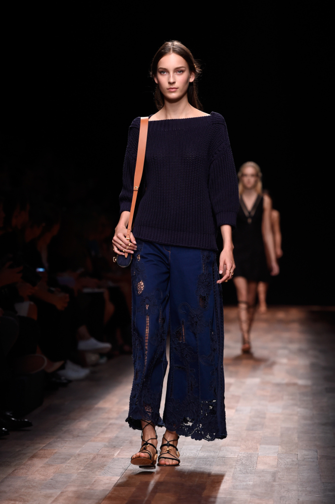 Valentino, PFW, collezione Primavera-Estate 2015: top blu navy a “grembiule” e pantaloni a palazzo