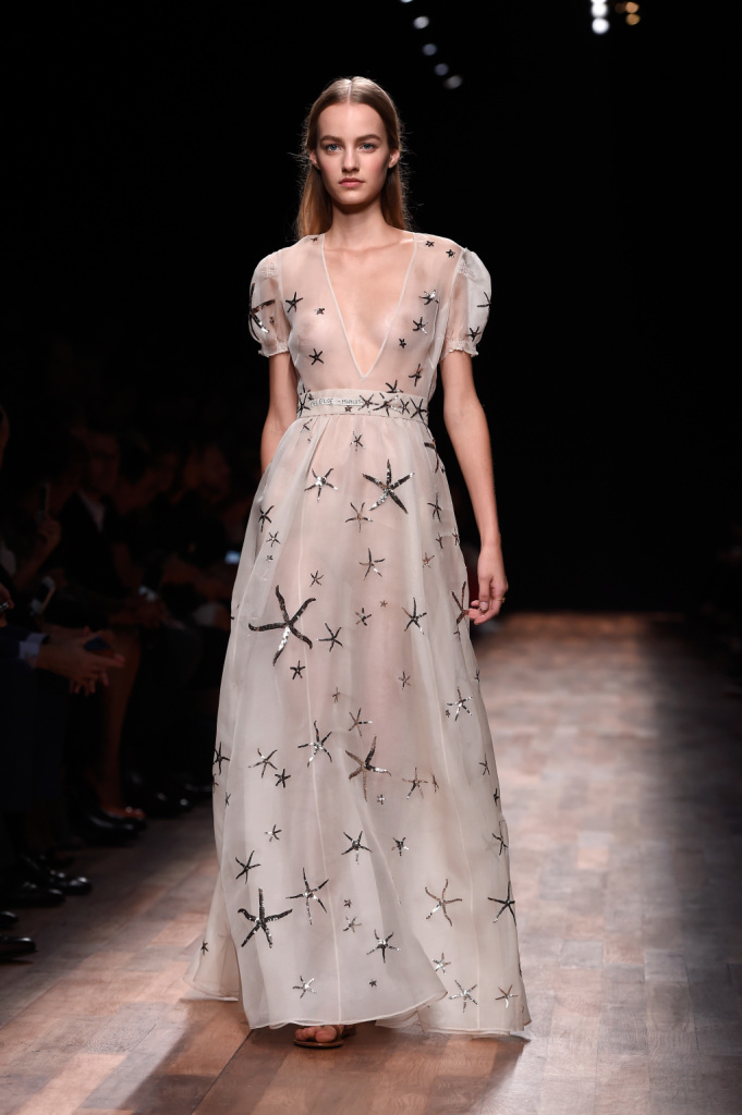 Valentino, PFW, collezione Primavera-Estate 2015: abito lungo con gioco trasparenze, maniche a palloncino, scollo a V e motivo stelle marine con paillettes argento