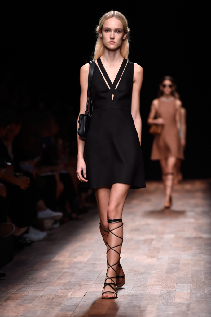 Valentino, PFW, collezione Primavera-Estate 2015: abito corto con gonna svasata e scollo a V con gioco a intreccio