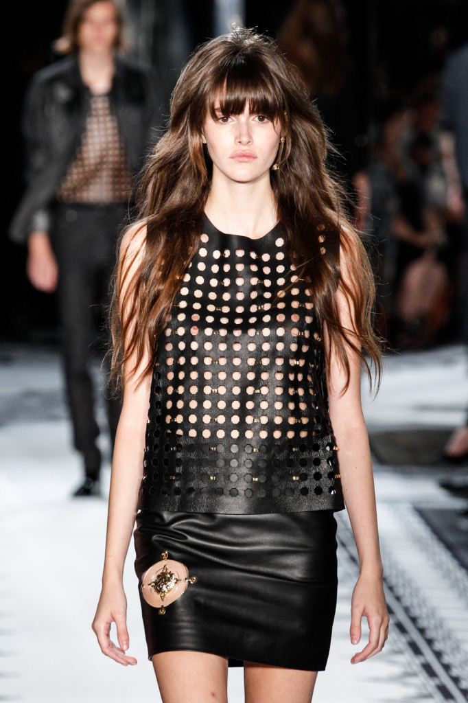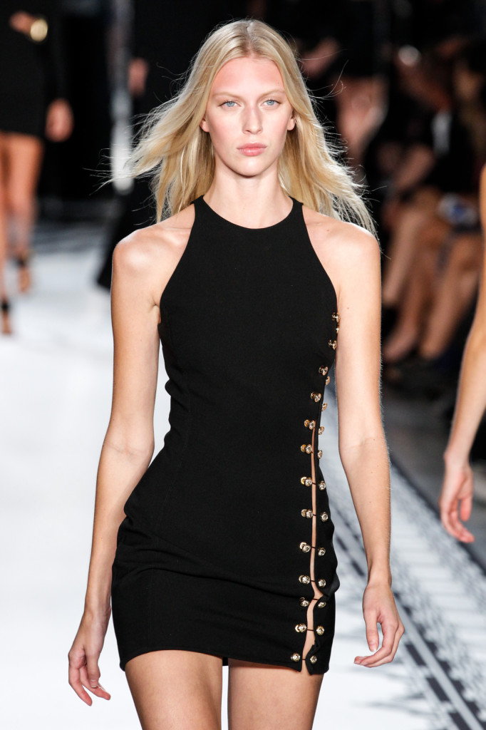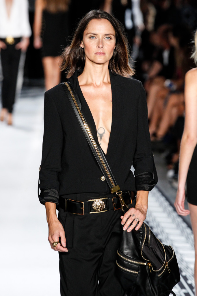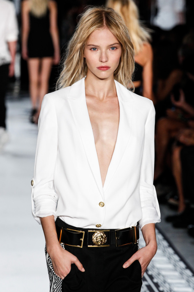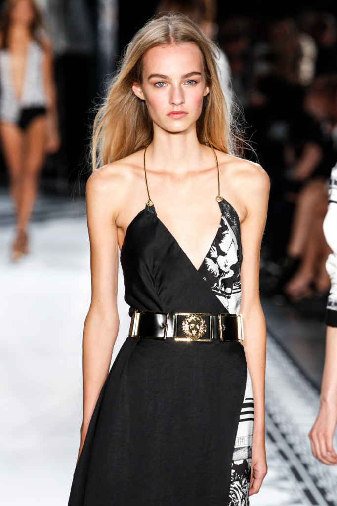 Per Versus Versace s/s 2015 Anthony Vaccarello ha disegnato una collezione estremamente sexy e provocante. Di più: sfrontata a tratti. Spacchi profondi, gonne molto mini e vestiti ridotti ai minimi, o perfino meno, con tagli netti e qualche centimetro di pelle lasciata nuda o con solo piercing, spille e spillette a testa di leone – soggetto riproposto anche in fibbie e cinture – a percorrerne gli spazi amiccanti e lasciati liberi dalla stoffa.