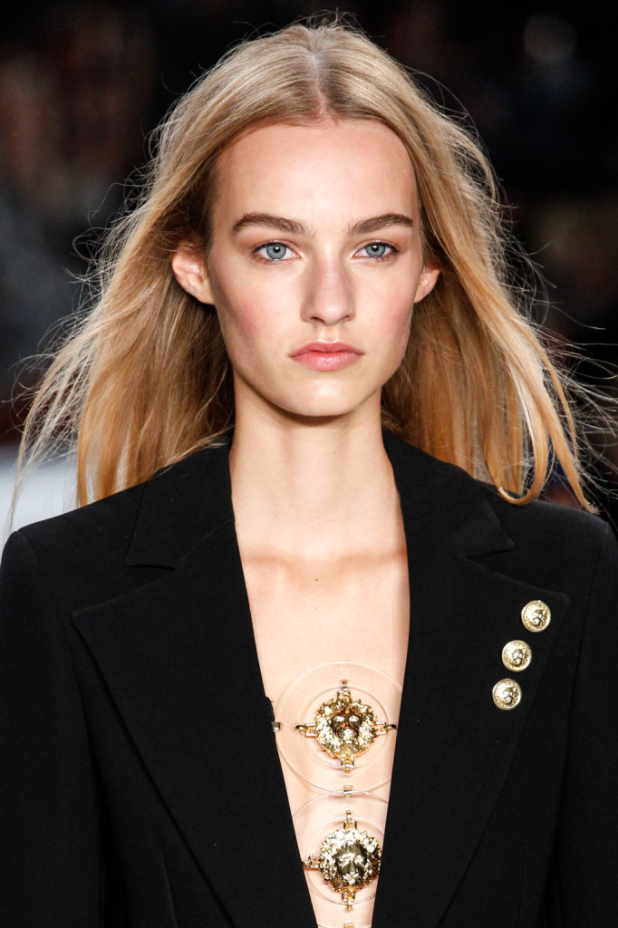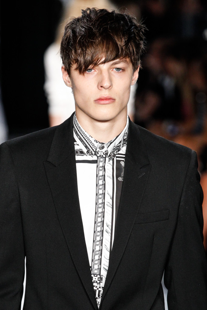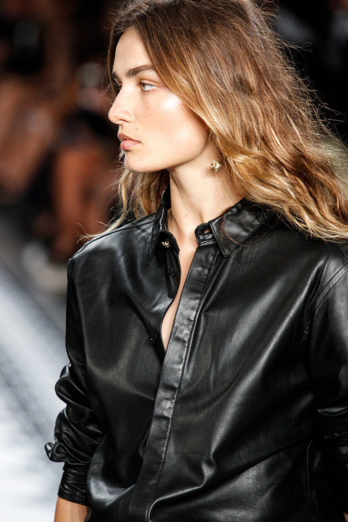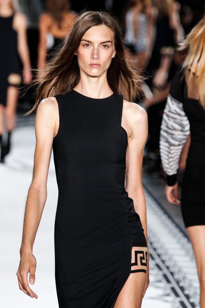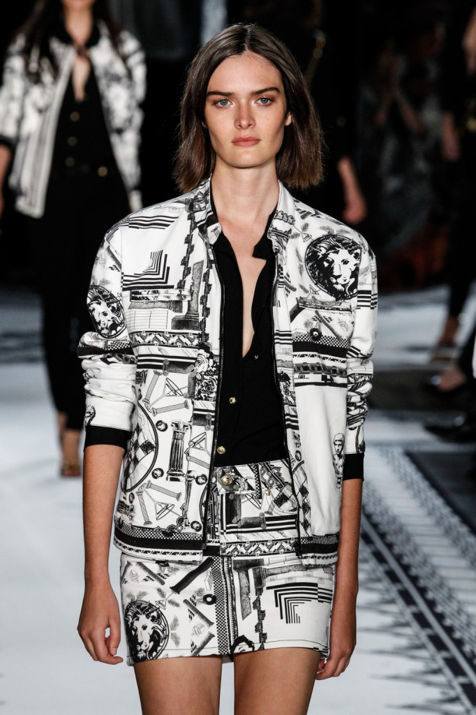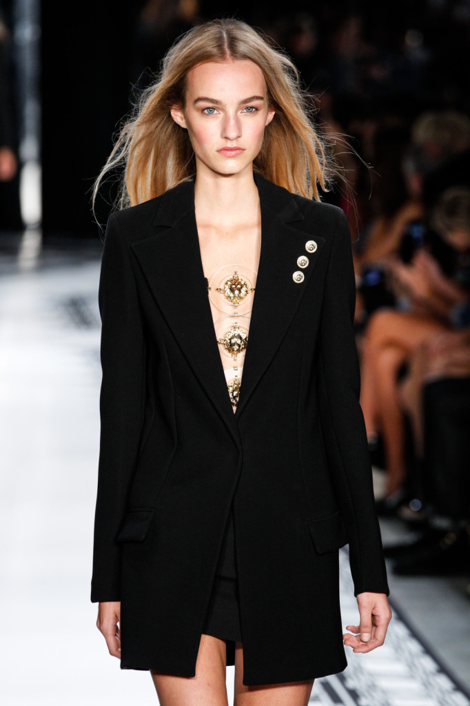 Per Versus Versace s/s 2015 Anthony Vaccarello ha disegnato una collezione estremamente sexy e provocante. Di più: sfrontata a tratti. Spacchi profondi, gonne molto mini e vestiti ridotti ai minimi, o perfino meno, con tagli netti e qualche centimetro di pelle lasciata nuda o con solo piercing, spille e spillette a testa di leone – soggetto riproposto anche in fibbie e cinture – a percorrerne gli spazi amiccanti e lasciati liberi dalla stoffa.