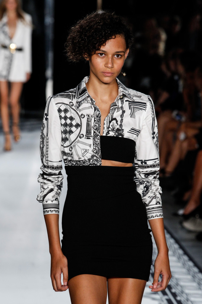 Stampa e nero, lunghezza mini e taglio asimmetrico sotto il seno / Versus Versace ss 2015