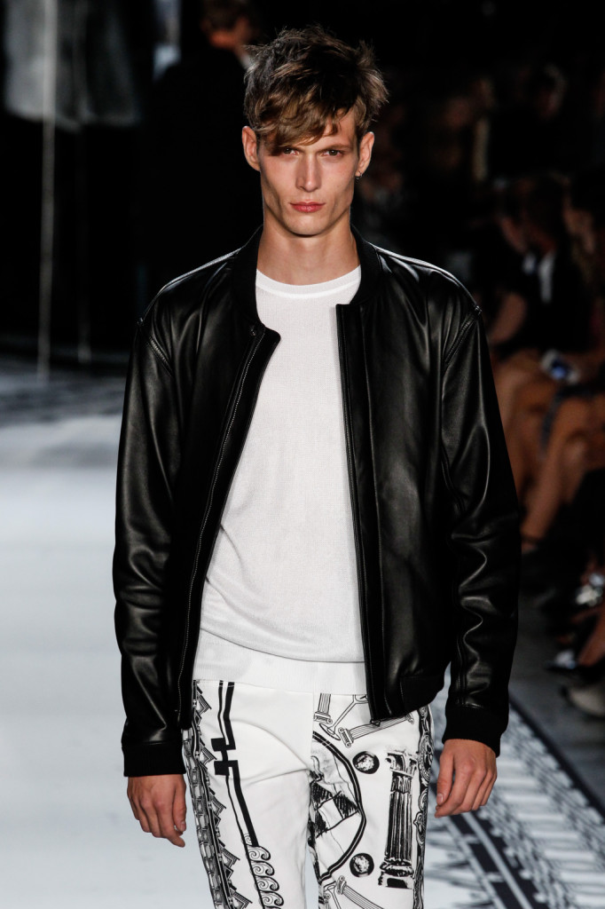 Giacca in pelle, t-shirt bianca e pantaloni con stampa / Versus Versace Men ss 2015