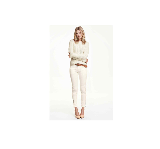 Look azzeccatissimo quello firmato H&M che propone pantalone bianco stretch con chiusura zip alle caviglie abbinato a un morbido maglione di lana a coste intrecciate, il tutto completato da décolleté color nude che donano un’aria sofisticata ed eterea a un look easy e casual.