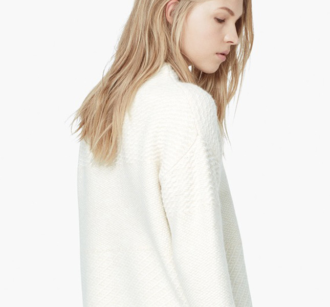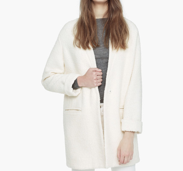 Oppure opta per un jeans skinny abbinato a un maglione tono su tono e un cappotto bouclé come quello proposto dal brand spagnolo Mango.