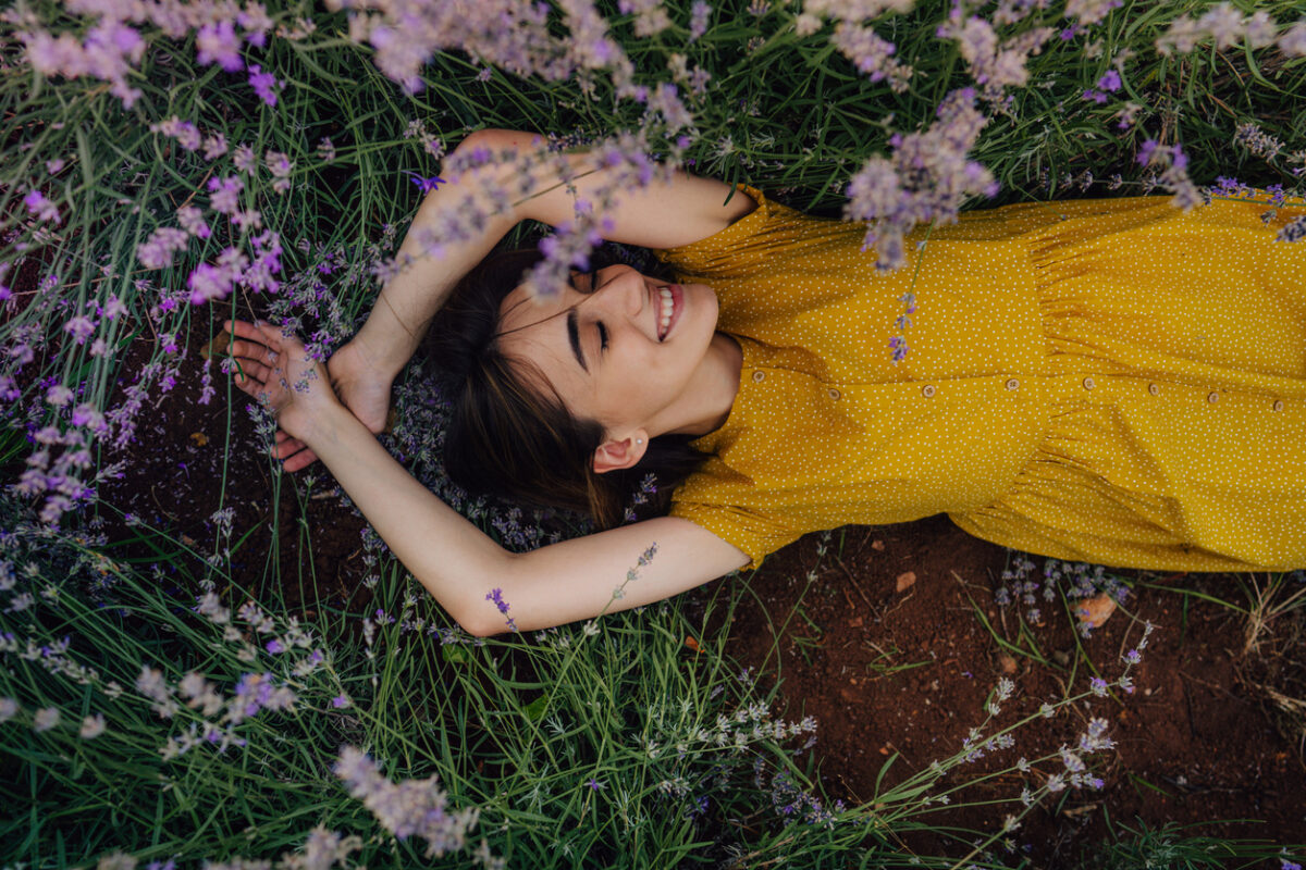 Donna distesa su un campo di fiori di lavanda
