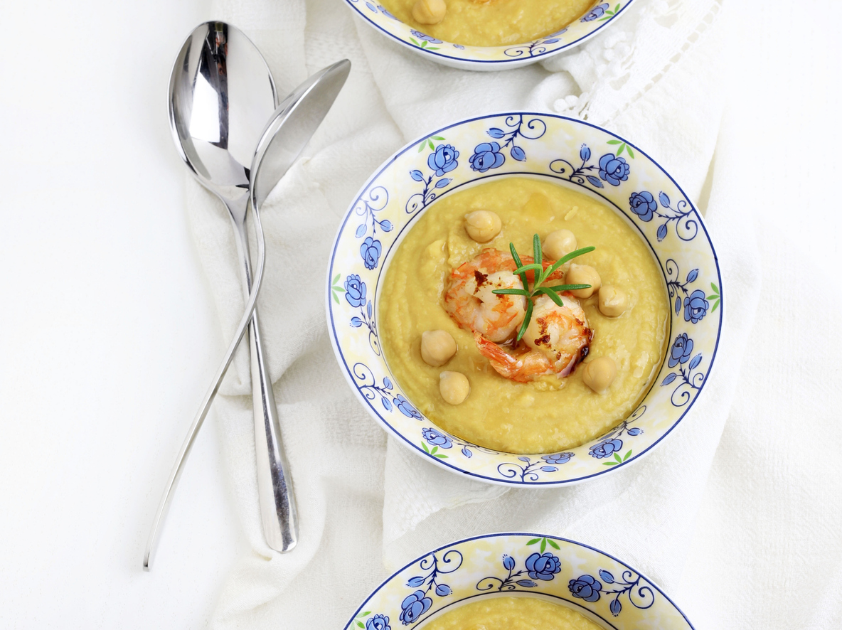 Questa vellutata di ceci e gamberi al curry è un piatto unico perfetto per le giornate invernali, e allo stesso tempo è light e gustosa