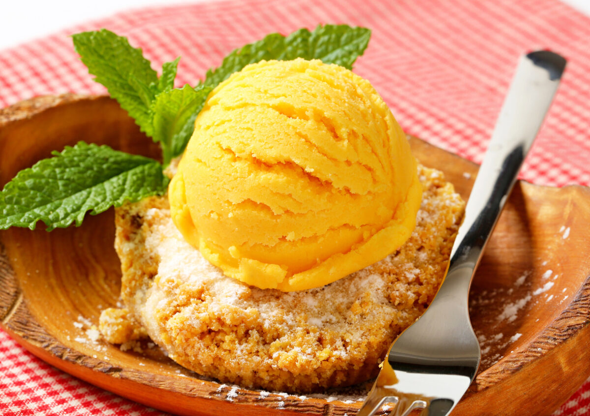 Almond cookie and scoop of ice cream served on olive wood bowl