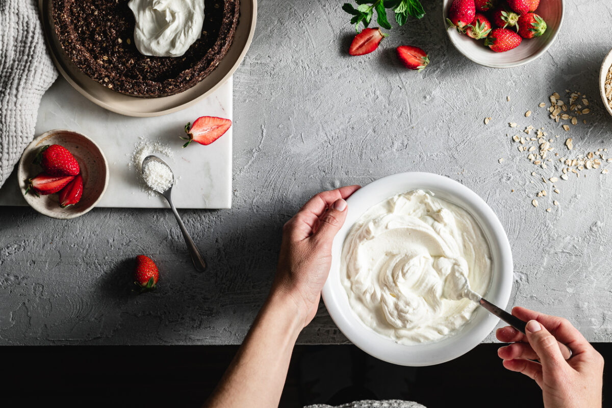- Prendete gli albumi che avevate messo da parte e montateli a neve; poi aggiungeteli al composto e, alla fine, incorporate una parte delle fragole che avevate preparato, mentre un’altra mantenetela per la decorazione.