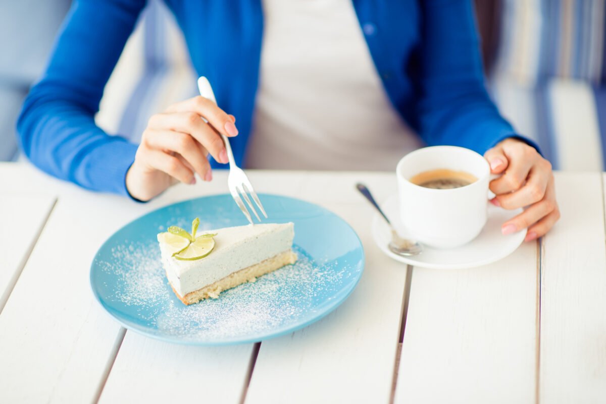 What a tasty morning! Cropped photo of a lady in casual outfit having coffee with nice dessert of a cheesecake on the white wooden desktop